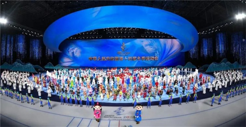 ▲2月17日晚,第十四屆全國(guó)冬季運(yùn)動(dòng)會(huì)開(kāi)幕式在內(nèi)蒙古自治區(qū)冰上運(yùn)動(dòng)訓(xùn)練中心速滑館舉行。圖片來(lái)源:草原全媒