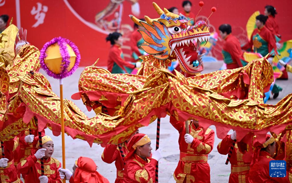 2月20日,在寧夏銀川市,參賽社火隊的演員為市民表演舞龍。