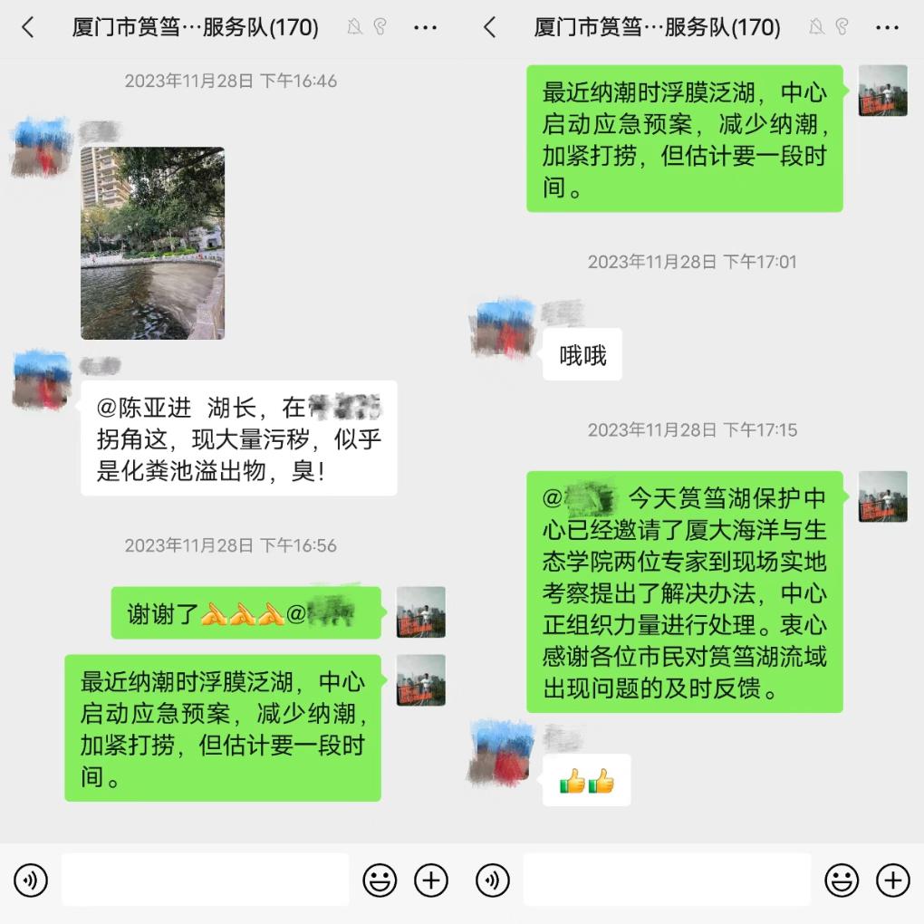 “你看,微信群里有人反映小區(qū)門(mén)口的湖水里有疑似化糞池溢出物,我們核實(shí)后啟動(dòng)了應(yīng)急預(yù)案,筼筜湖保護(hù)中心邀請(qǐng)專(zhuān)家實(shí)地考察后給出了解決方案。”陳亞進(jìn)指著手機(jī)屏幕向記者介紹道。在這個(gè)名為“廈門(mén)市筼筜藍(lán)志愿服務(wù)隊(duì)”的微信群中,時(shí)不時(shí)有人@湖長(zhǎng)反映問(wèn)題,“這些都是我們志愿服務(wù)隊(duì)的骨干,他們發(fā)現(xiàn)問(wèn)題就@我,我上報(bào)給筼筜湖保護(hù)中心,由他們來(lái)解決問(wèn)題。”