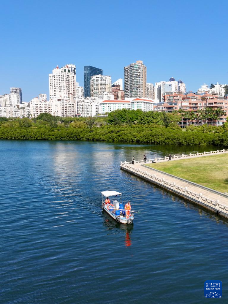 1月24日,一艘環(huán)衛(wèi)船行駛在廈門(mén)筼筜湖湖面上(無(wú)人機(jī)照片)。新華社記者 姜克紅 攝