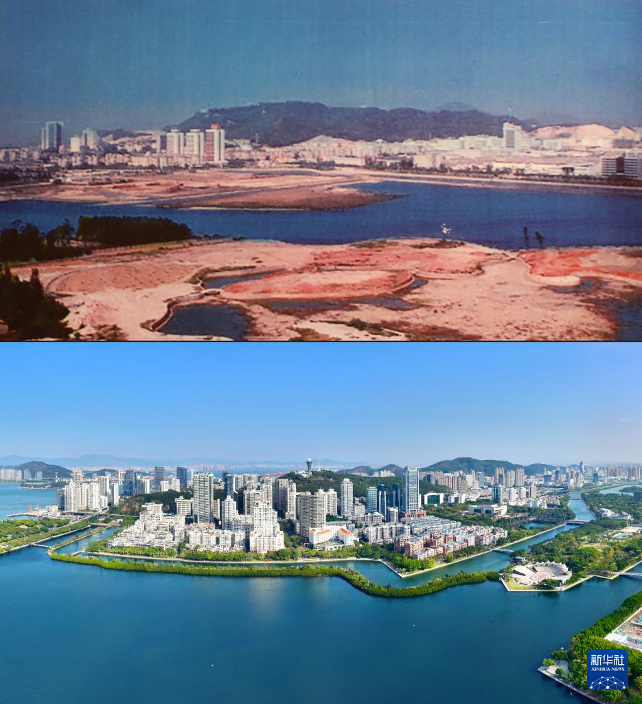 拼版照片:上圖為20世紀(jì)80年代的廈門(mén)筼筜湖(資料照片);下圖為2024年1月24日拍攝的廈門(mén)筼筜湖及周邊城市景觀(guān)(新華社記者姜克紅攝,無(wú)人機(jī)照片)。