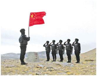 圖為霍爾邊境派出所民警在界樁前向國旗敬禮。