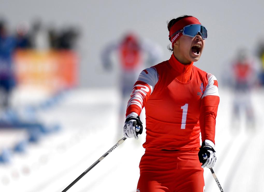 2月25日,黑龍江隊選手靳然在沖刺時慶祝。新華社記者 黃博涵 攝