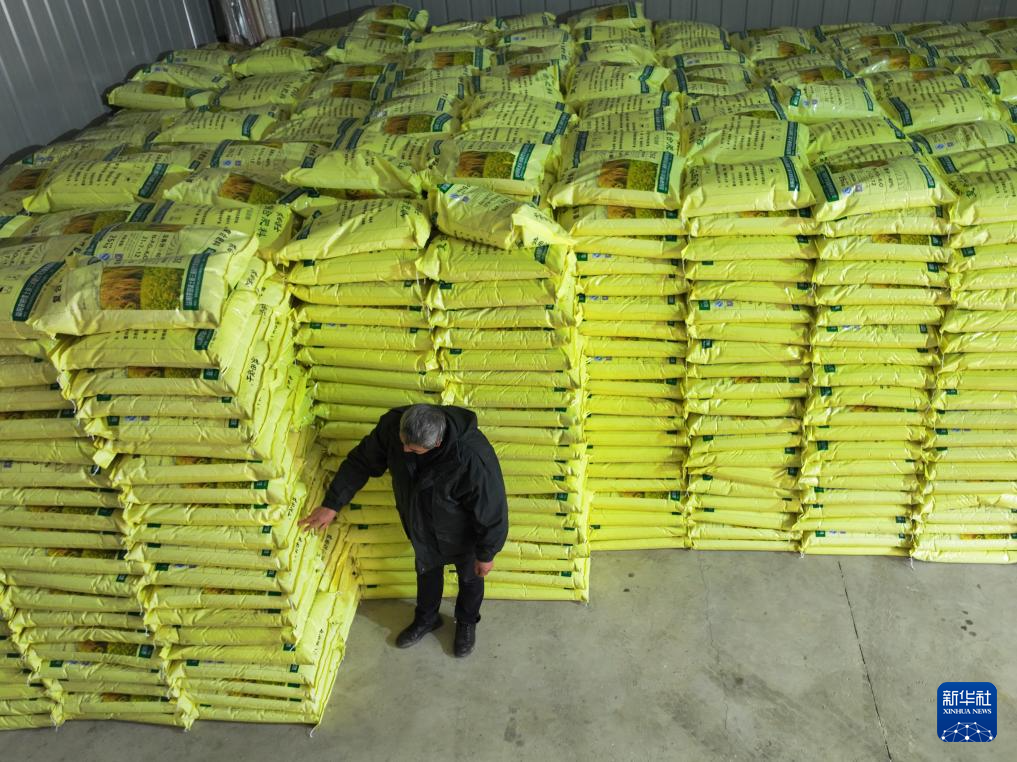 2月25日,在湖南省益陽市赫山區(qū)農(nóng)田謀士水稻專業(yè)合作社,工作人員在查看復(fù)合肥料儲(chǔ)備情況(無人機(jī)照片)。