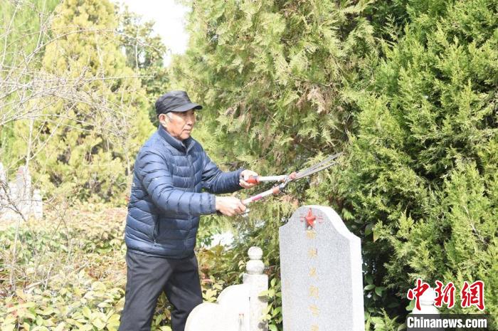 中新網徐州3月16日電 (朱志庚 譚曉立)“既然找不到烈士的家屬,那么我就是他們的親人,39年來逢年過節(jié)我都會代替他們家屬過來祭掃?!?月15日,江蘇省睢寧縣雙溝鎮(zhèn)紀灣村村民紀厚軍來到紀灣烈士陵園修剪松樹、綠植,為烈士墓碑描紅、擦拭。