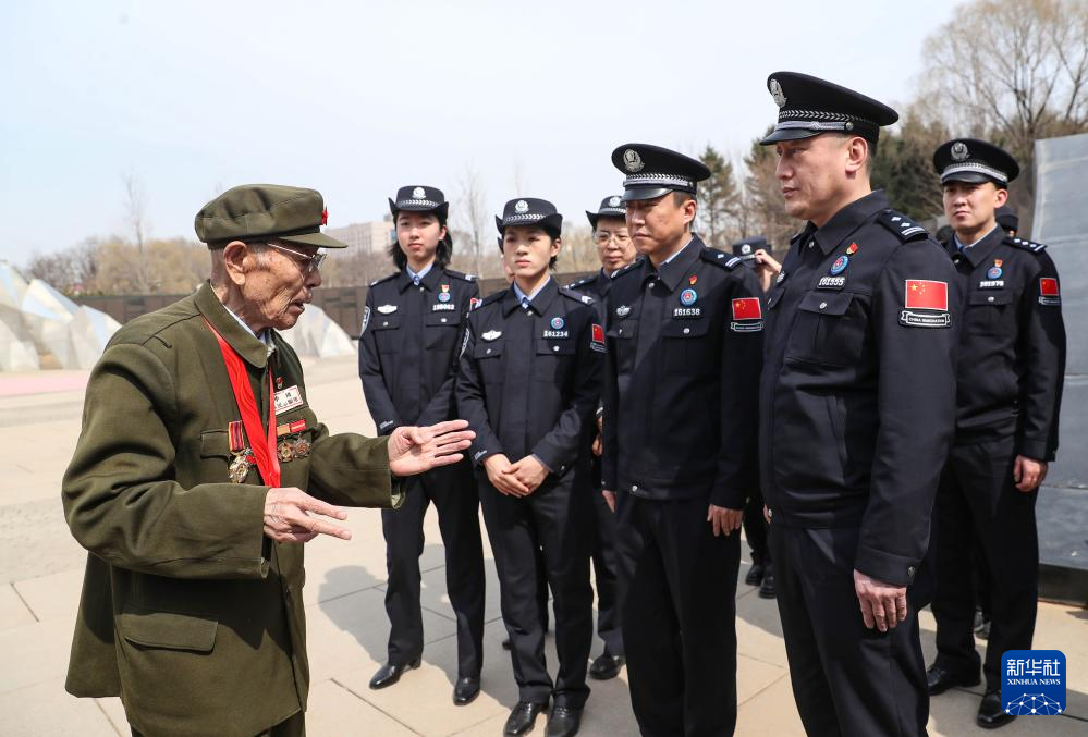 4月2日,在沈陽(yáng)抗美援朝烈士陵園,志愿軍老戰(zhàn)士金東輝(左一)為沈陽(yáng)出入境邊防檢查站民警講述戰(zhàn)斗故事。