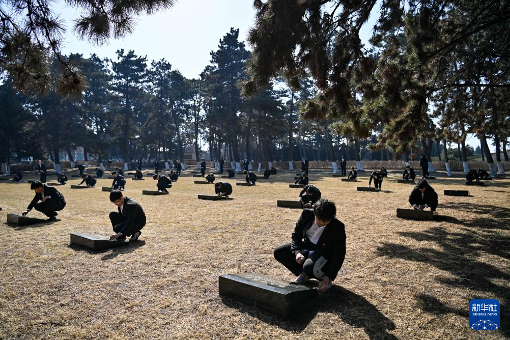 4月2日,吉林農(nóng)業(yè)大學(xué)學(xué)生在長春市革命烈士陵園的烈士墓碑前祭掃。