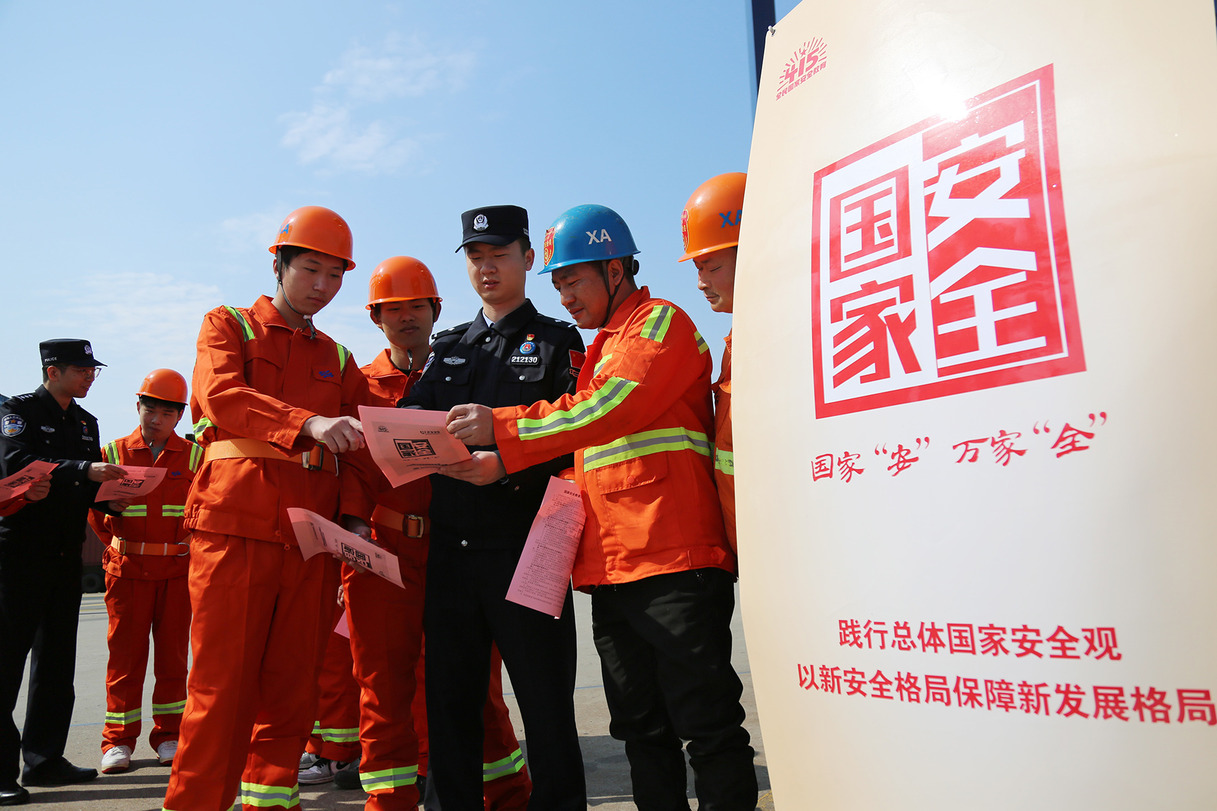 圖為4月10日,民警在大榭港區(qū)集裝箱碼頭開展國(guó)家安全教育。