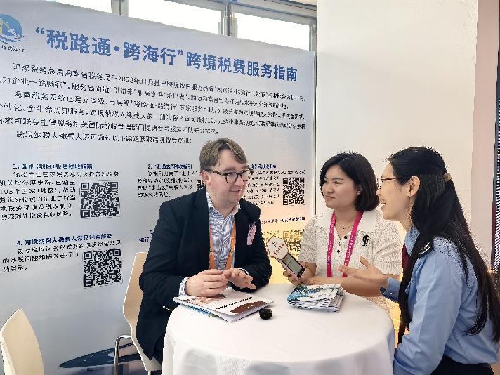 為了更好地服務來自世界各地的展商及嘉賓,海南稅務部門成立了由3名外語人才和2名國際稅收專家組成的“稅路通·跨海行”跨境稅費服務團隊,在提供中英雙語咨詢服務的同時,還現(xiàn)場舉辦跨境稅費服務及政策講解直播,詳細講解針對跨境投資者的稅收優(yōu)惠政策。