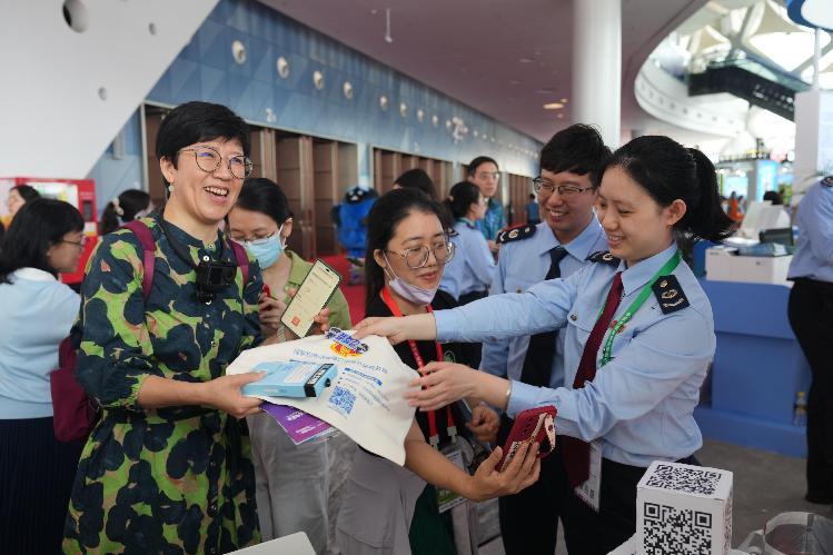 海南稅務部門“稅路通·跨海行”跨境稅費服務團隊為參展商和現(xiàn)場觀眾提供中英雙語稅收服務。海南省稅務局供圖