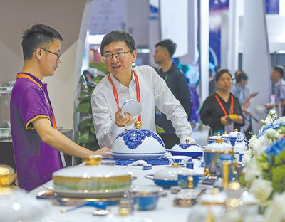 中國國際消費品博覽會成為引領消費時尚和促進消費轉型升級的重要平臺,吸引了全球眾多優(yōu)質品牌前來參展。圖為消博會全球特色消費展區(qū)景德鎮(zhèn)展臺。