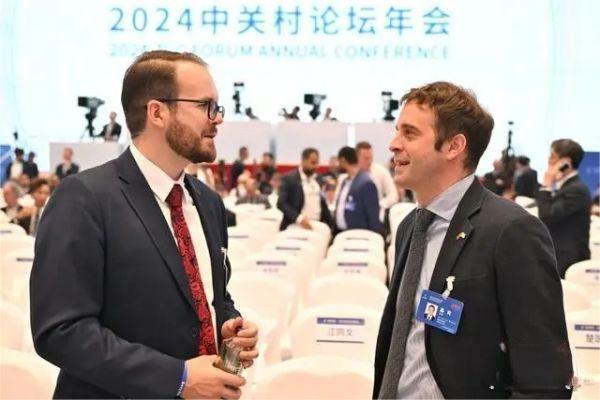 4月25日,2024中關(guān)村論壇年會在北京開幕。圖為與會嘉賓會前交流