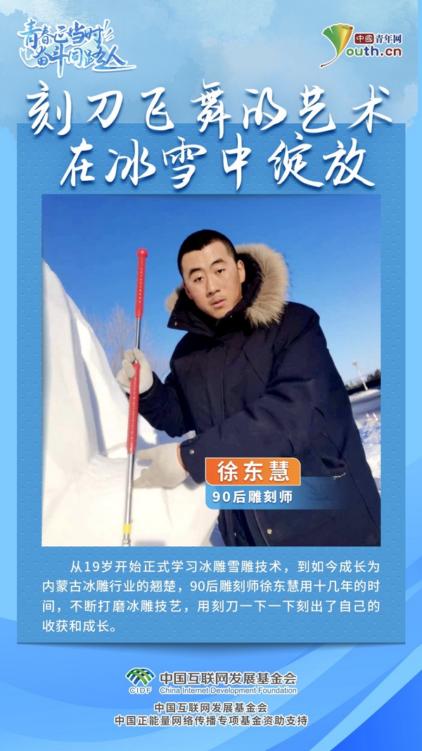 “剛開始做冰雕的時候,感覺這個工作很苦很累,有時候在冰天雪地里一待就是一整天。當(dāng)時也產(chǎn)生過放棄的想法,行業(yè)的一些前輩就一邊教我工作一邊鼓勵我,引導(dǎo)我,也是在他們的幫助下,我堅持了下來?!毙鞏|慧說,“后來我慢慢有了自己的團(tuán)隊,從剛開始的幾人到幾十人,現(xiàn)在已經(jīng)是個一百多人的團(tuán)隊了?!庇捎诔D甑牡蜏貞敉夤ぷ鳎L(fēng)吹日曬讓他的皮膚變得黝黑且粗糙,也見證了他從一個青澀的學(xué)徒,成長為一個冰雕團(tuán)隊負(fù)責(zé)人的歷程。