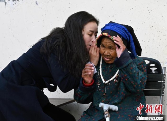 格西王姆(左)在馬爾康市敬老院與老年人聊天。 安源 攝