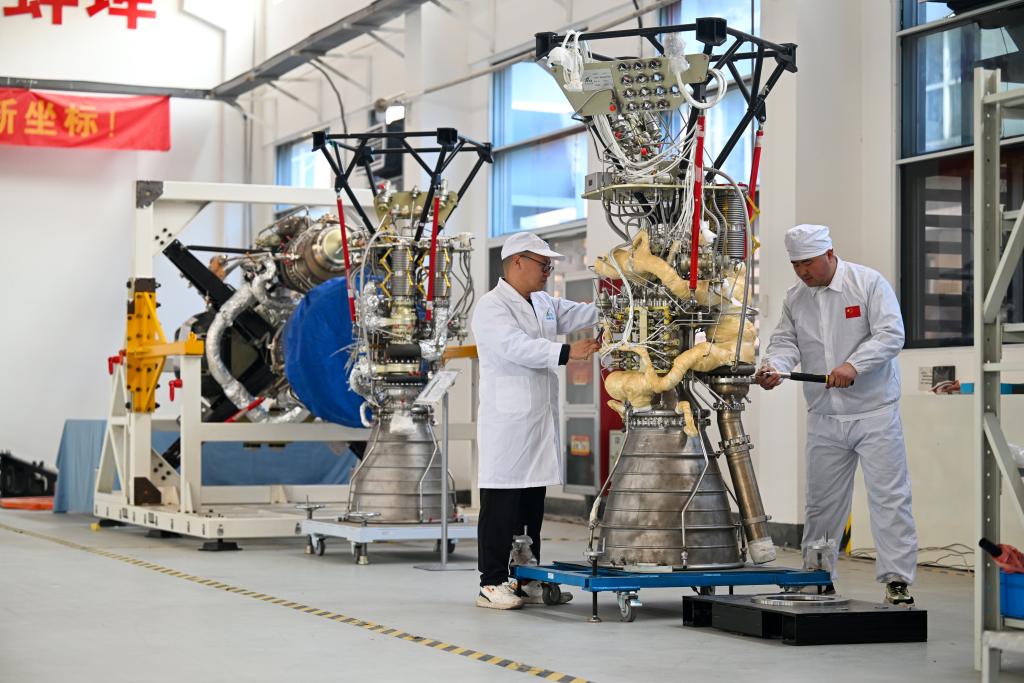 2024年3月11日,在安徽九州云箭航天技術(shù)有限公司生產(chǎn)基地,技術(shù)人員對(duì)即將交付的液體火箭發(fā)動(dòng)機(jī)進(jìn)行最后的檢查。 新華社發(fā)(黃洋洋攝)