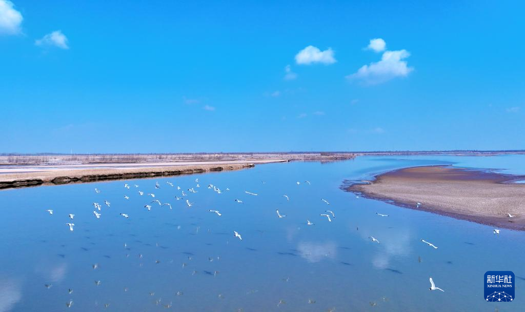 在黃河寧夏段,候鳥在灘涂上空飛翔(2024年3月1日攝,無人機(jī)照片)。新華社記者 王鵬 攝
