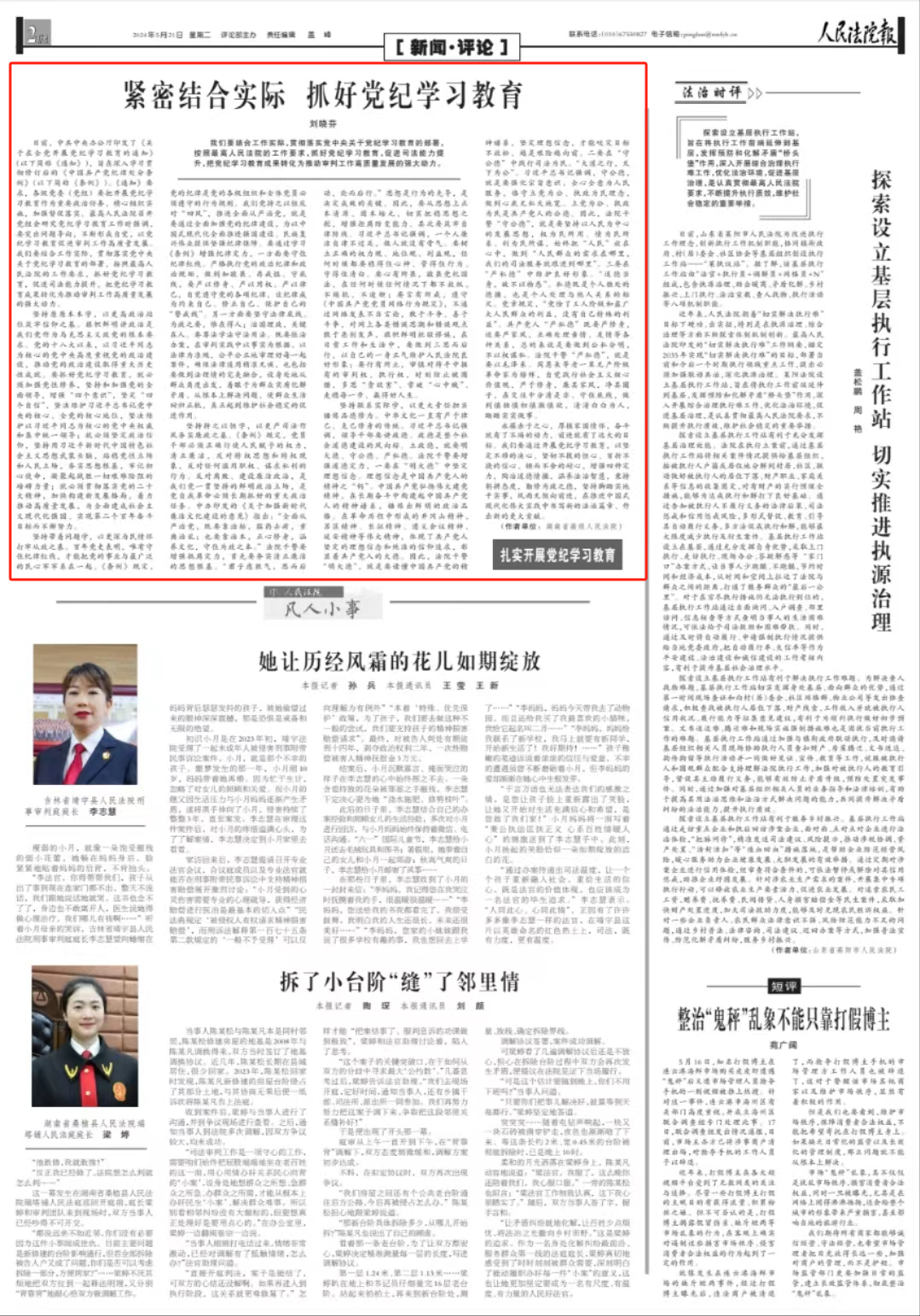 堅(jiān)持帶著問(wèn)題學(xué),以更深為民情懷打牢從政之基。百年黨史表明,唯有守住紀(jì)律紅線,才能把黨的事業(yè)與最廣泛的民心牢牢系在一起。《條例》規(guī)定,黨的紀(jì)律是黨的各級(jí)組織和全體黨員必須遵守的行為規(guī)則。我們黨持之以恒反對(duì)“四風(fēng)”,推進(jìn)全面從嚴(yán)治黨,就是要通過(guò)全面加強(qiáng)黨的紀(jì)律建設(shè),為以中國(guó)式現(xiàn)代化全面推進(jìn)強(qiáng)國(guó)建設(shè)、民族復(fù)興偉業(yè)提供堅(jiān)強(qiáng)紀(jì)律保障。要通過(guò)學(xué)習(xí)《條例》增強(qiáng)紀(jì)律定力,一方面要守住紀(jì)律紅線。嚴(yán)格執(zhí)行黨的政治紀(jì)律和政治規(guī)矩,做到知敬畏、存戒懼、守底線,要嚴(yán)以修身、嚴(yán)以用權(quán)、嚴(yán)以律己,自覺(jué)遵守黨的各項(xiàng)紀(jì)律,讓紀(jì)律成為約束自己、修正自己、保護(hù)自己的“警戒線”。另一方面要堅(jiān)守法律底線。為政之要,惟在得人;治國(guó)理政,關(guān)鍵在人。要尊法學(xué)法守法用法。既要依法辦案,在審判實(shí)踐中以事實(shí)為根據(jù)、以法律為準(zhǔn)繩,公平公正地審理好每一起案件,確保法律適用精準(zhǔn)無(wú)誤,也包括要做到法理情的完美融合,設(shè)身處地從群眾角度出發(fā),著眼于為群眾實(shí)質(zhì)化解矛盾、從根本上解決問(wèn)題,使群眾生活回歸正軌,真正起到維護(hù)社會(huì)穩(wěn)定的促進(jìn)作用。