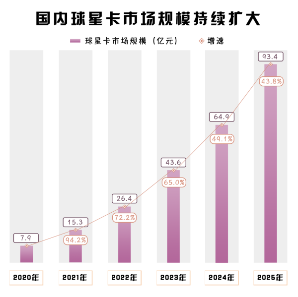 從艾瑞咨詢發(fā)布的數(shù)據(jù)來看,2024年,中國球星卡行業(yè)市場(chǎng)規(guī)模將達(dá)到64.9億元,相比2023年增長49.1%,預(yù)計(jì)在2025年其市場(chǎng)規(guī)模將突破90億元。