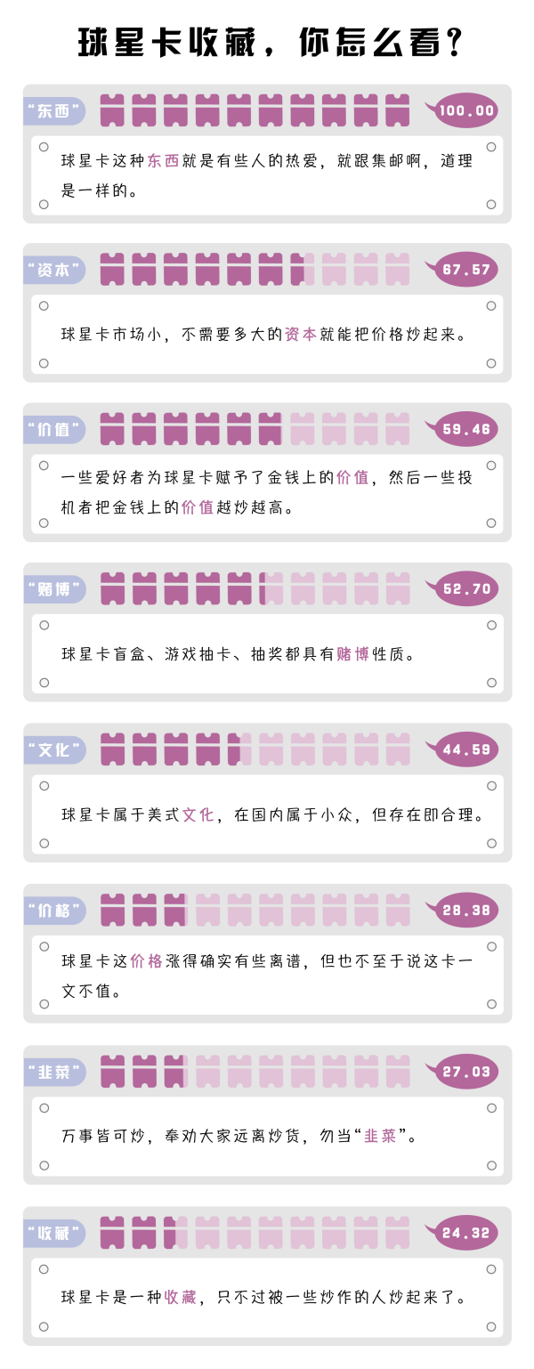 面對(duì)話題熱度與價(jià)值不斷攀升的球星卡,有的網(wǎng)友認(rèn)為球星卡收藏跟集郵是一個(gè)道理,熱愛無需理由,存在即合理;有的網(wǎng)友則表示,“天價(jià)”球星卡背后存在資本運(yùn)作,炒作球星卡已經(jīng)成為某些人的斂財(cái)手段;也有網(wǎng)友呼吁大家理性消費(fèi),勿盲目跟風(fēng)、投機(jī)倒把,別被市場(chǎng)當(dāng)成“韭菜”。