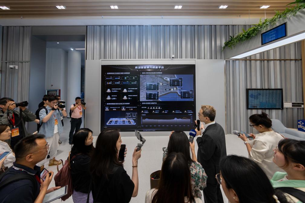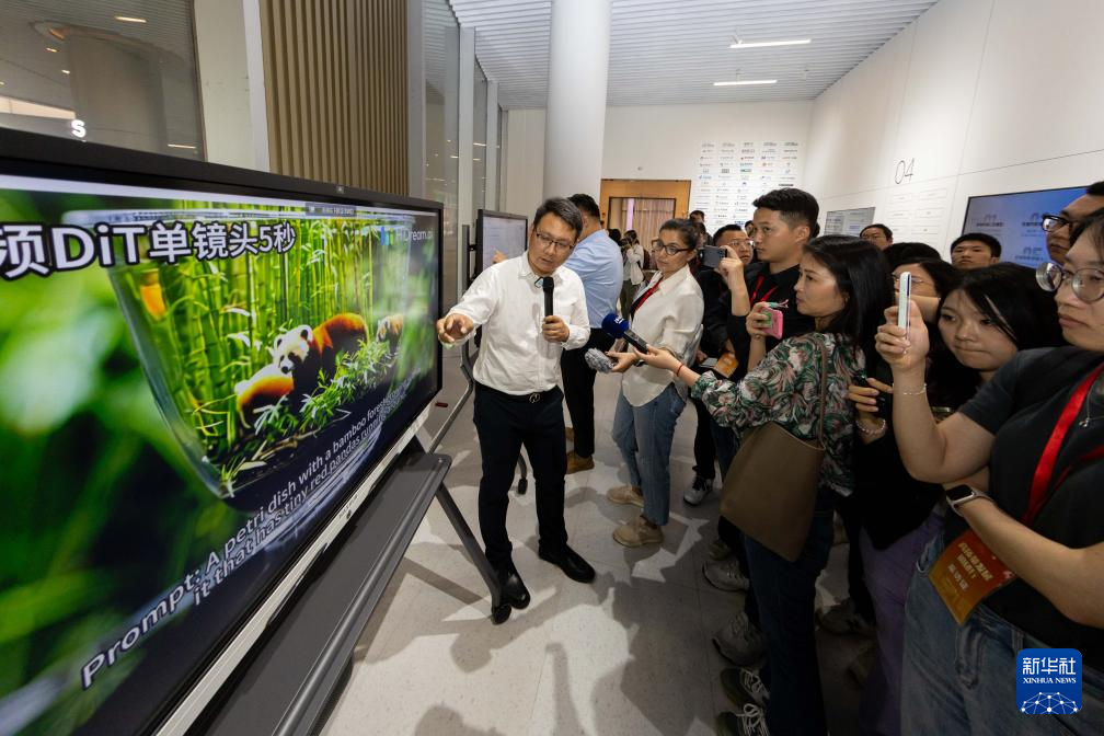 5月23日,大模型企業(yè)、智象未來(lái)生態(tài)合作部總經(jīng)理沈偉峰為采訪(fǎng)團(tuán)介紹運(yùn)用大模型文生視頻。新華社記者 王翔 攝