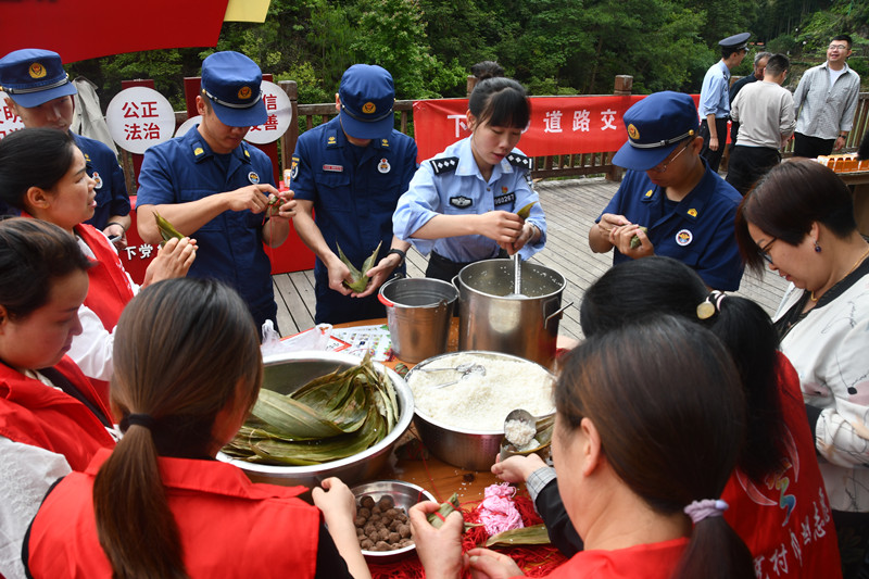 端午節(jié)臨近,福建省壽寧縣公安局下黨派出所民警6月4日聯(lián)合消防員、志愿者等群防群治力量走進(jìn)轄區(qū)村居,與群眾一起包粽子,同時做好防盜防火防騙等宣傳。