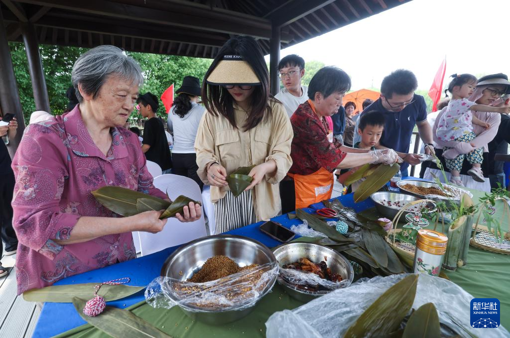 5月25日,在東林鎮(zhèn)泉益村活動現(xiàn)場,村民在包粽子。