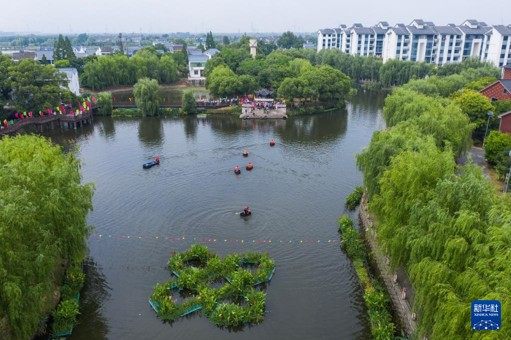 5月25日,村民們參加水鄉(xiāng)劃菱桶比賽。菱桶是河網密布的東林鎮(zhèn)百姓家中常見的一種傳統(tǒng)水上勞動工具,村民在捕魚、采菱、采荷時都要用到(無人機照片)。
