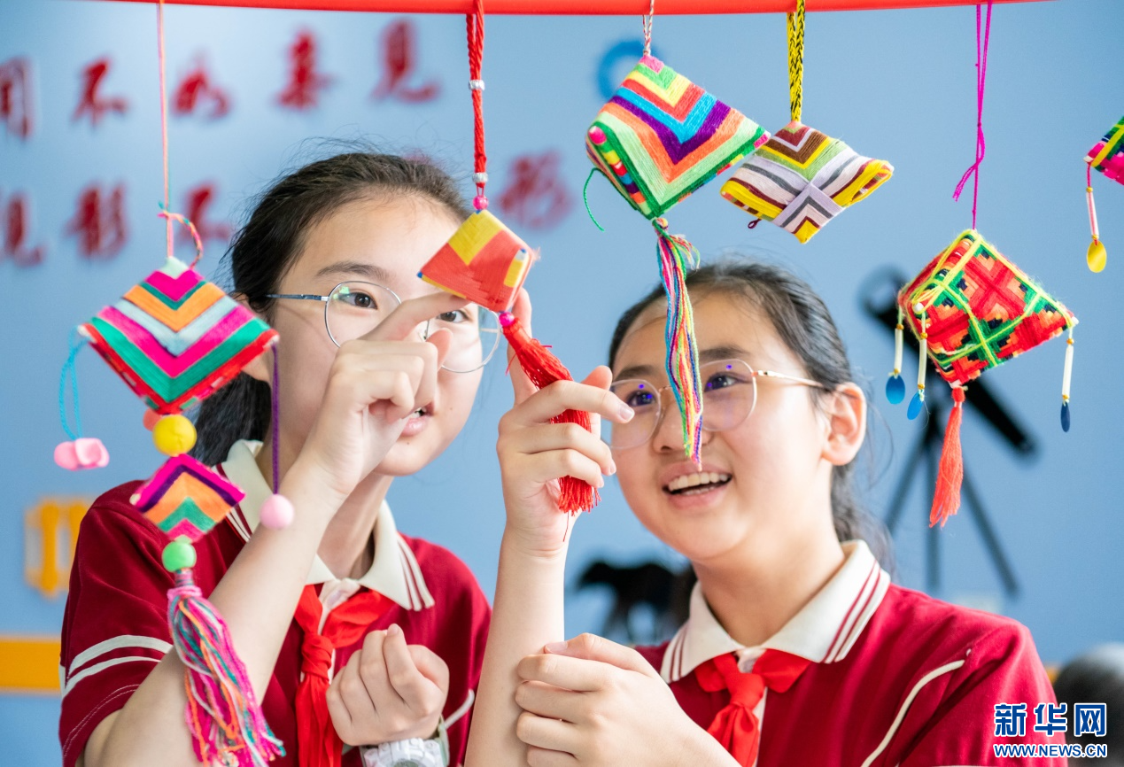 6月4日,呼和浩特市玉泉區(qū)恒昌店巷小學學生在欣賞制作完成的“七彩粽子”香囊。新華網(wǎng)發(fā)(丁根厚 攝)