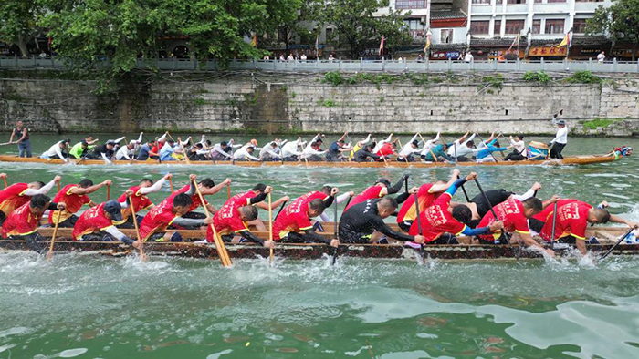 河面上船槳舞動、水花四濺,一艘艘龍舟競速沖刺。這是今年端午節(jié)期間,貴州省鎮(zhèn)遠(yuǎn)縣舉行的賽龍舟活動上的一幕。