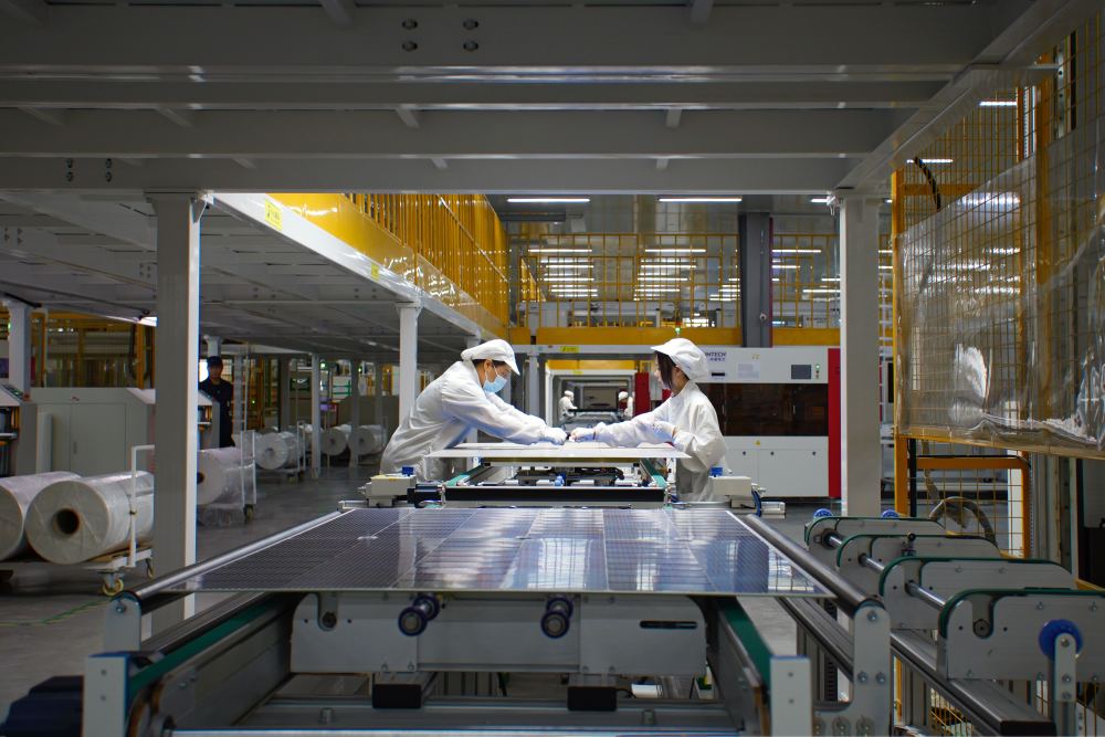 在安徽省滁州市鳳陽縣一家光伏企業(yè)內(nèi),工人在生產(chǎn)線上忙碌(2023年6月14日攝)。新華社發(fā)