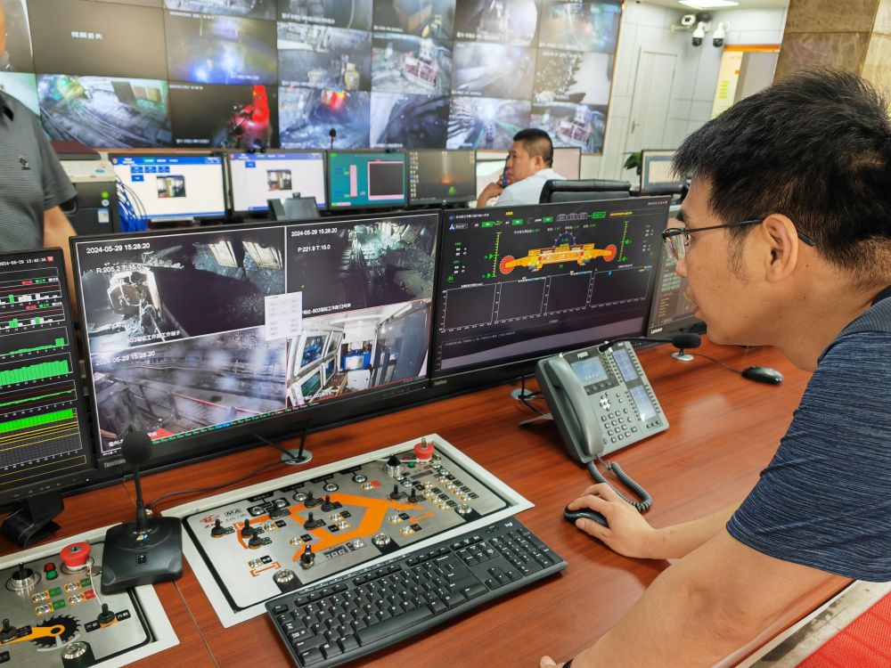 在山西省霍州市的山西焦煤集團(tuán)李雅莊煤礦,綜采隊(duì)技術(shù)員在井上控制井下割煤機(jī)(2024年5月29日攝)。新華社記者 王勁玉 攝