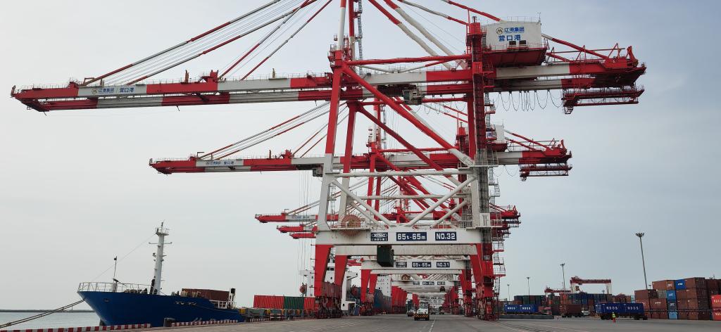 藍(lán)天碧海,波光粼粼。遼東灣畔的營口港集裝箱碼頭一派繁忙景象。巨型門式起重機(jī)將一個個集裝箱“抓”起,平穩(wěn)移至??吭诖a頭邊的貨輪上。堆場上,數(shù)量眾多的待發(fā)集裝箱整齊擺放,即將裝船出海。