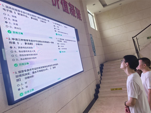 利用線上線下同時推進,形成合力,強化協(xié)調(diào)配合。線上,通過微信群督促打卡,確保全體干部職工按時保質(zhì)答題;線下,利用LED顯示屏滾動播放煙草法律法規(guī)宣傳海報,營造全員學習的濃厚氛圍。
