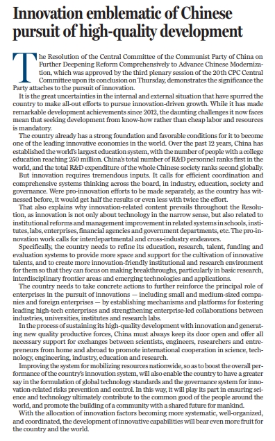 原標(biāo)題:Innovation emblematic of Chinese pursuit of high-quality development
