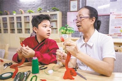 “巧姐”潘慧君給小學剛畢業(yè)的黃奕錚傳授制作乞巧作品的技巧