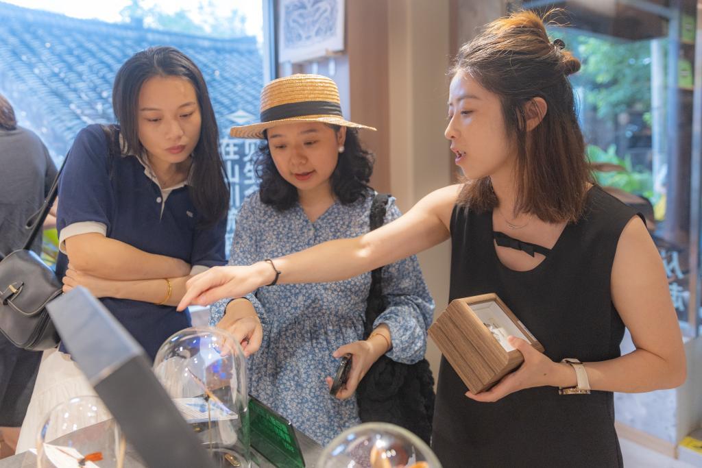 7月28日,在龍門浩老街·下浩里,青年創(chuàng)業(yè)者曾進(jìn)(右一)在她主理的方舟遺留物·標(biāo)本工作室內(nèi)為游客講解標(biāo)本知識(shí)。新華社記者 黃偉 攝