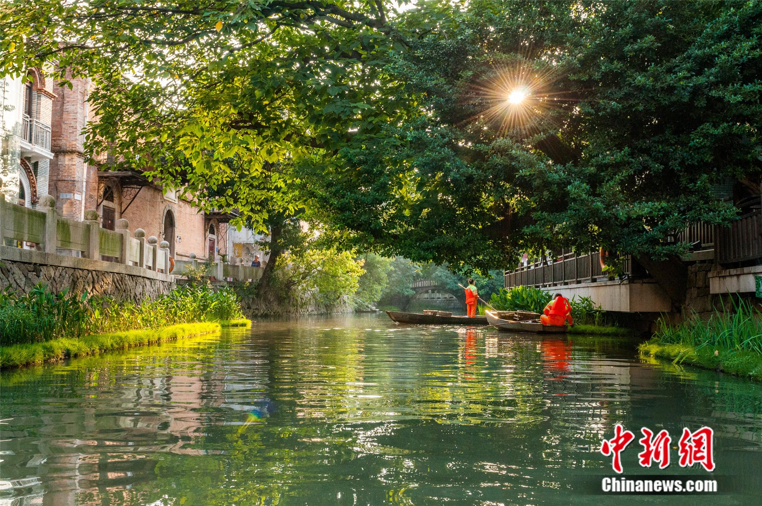 保潔工人在三捷河上清理雜物,確保內(nèi)河潔凈。福州市水務(wù)公司供圖