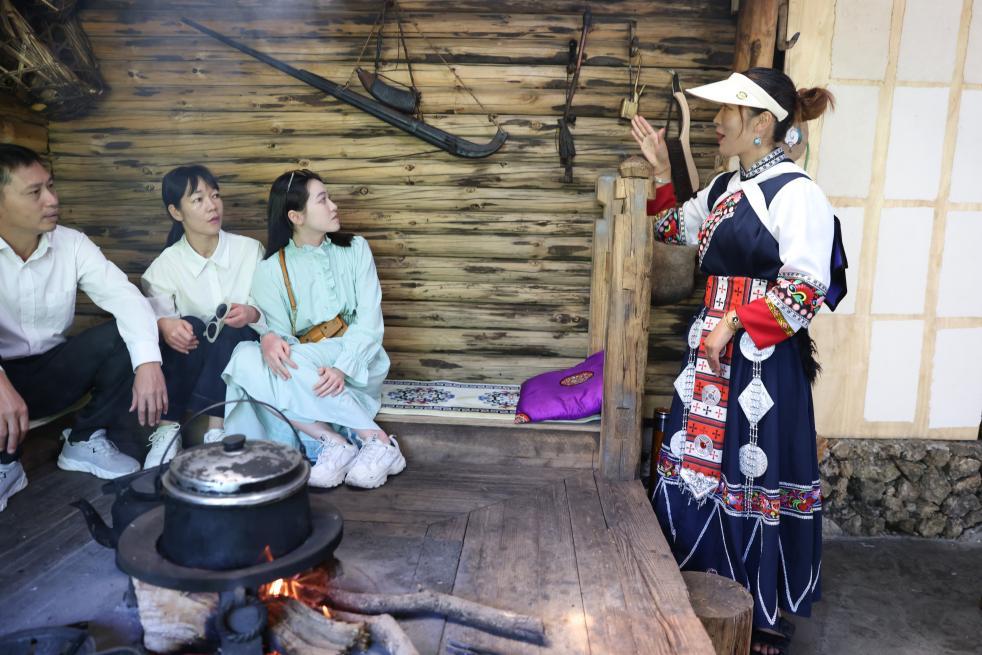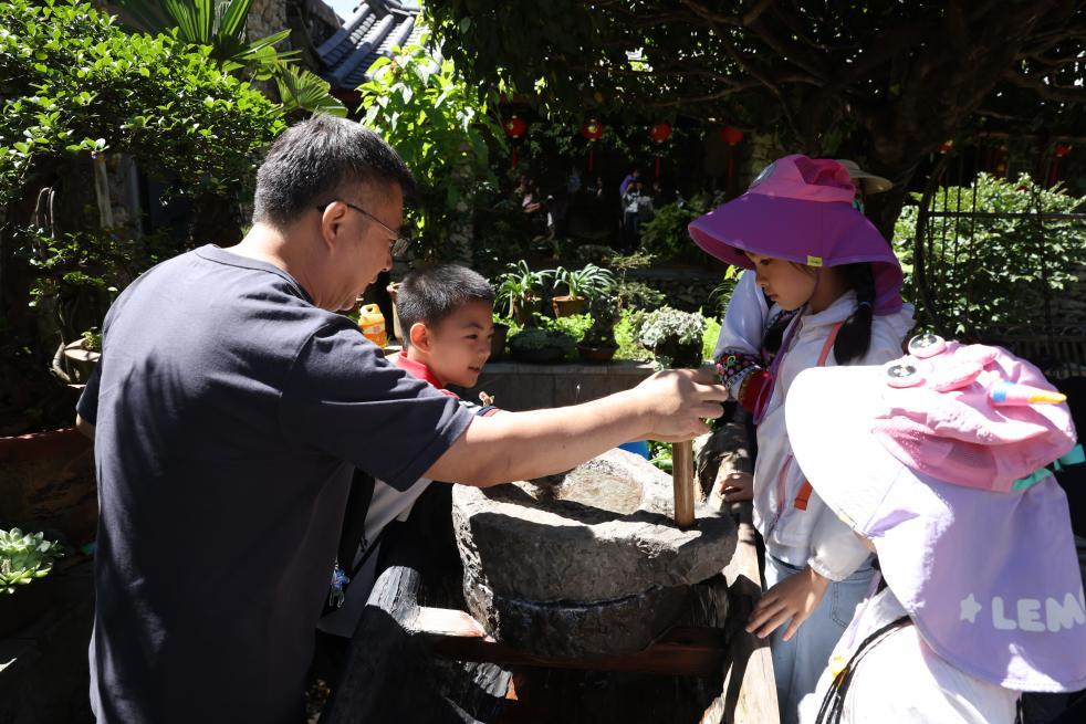 7月31日,廣西游客藍夢婷一家在麗江市玉龍納西族自治縣玉湖村的一處納西族村民家中體驗當(dāng)?shù)靥厣幕P氯A社記者 呂帥 攝