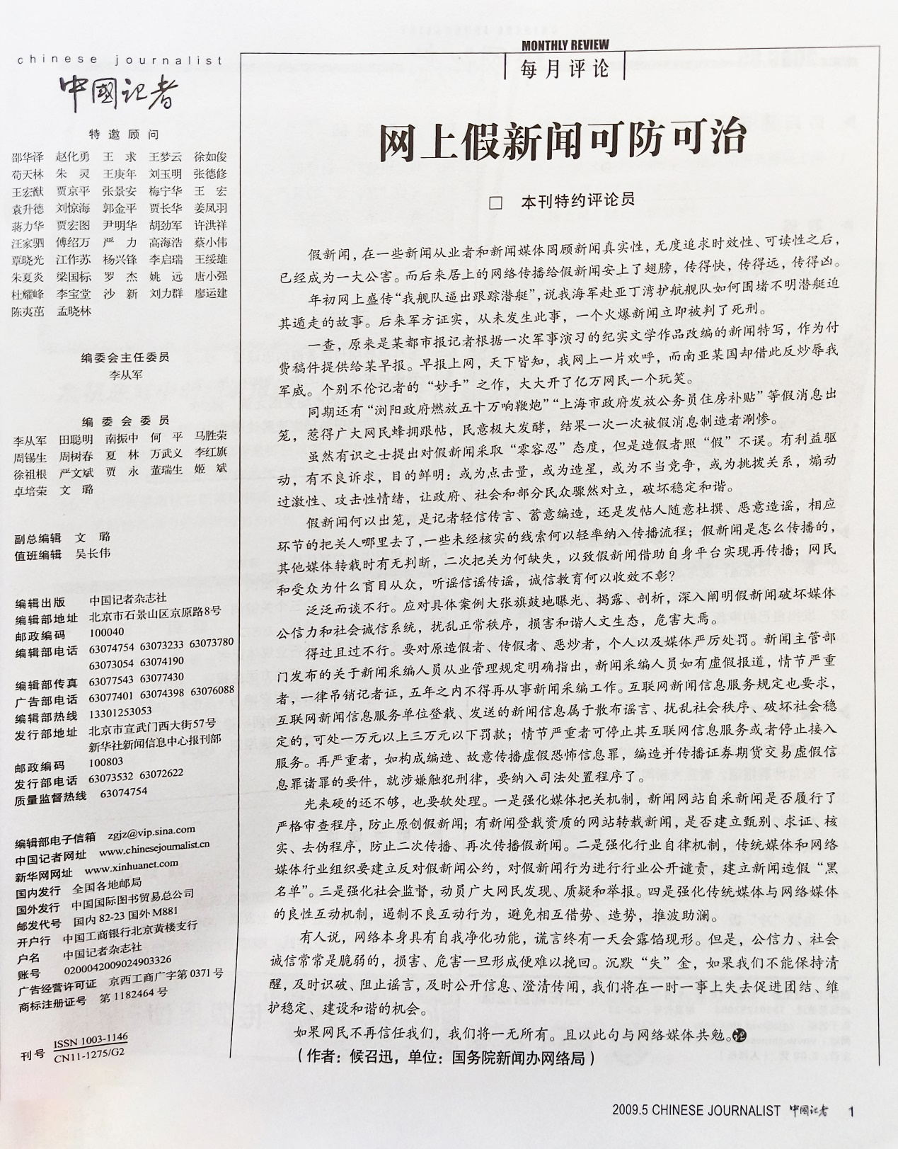《中國(guó)記者》雜志2009年第5期“每月評(píng)論”刊發(fā)《網(wǎng)上假新聞可防可治》。