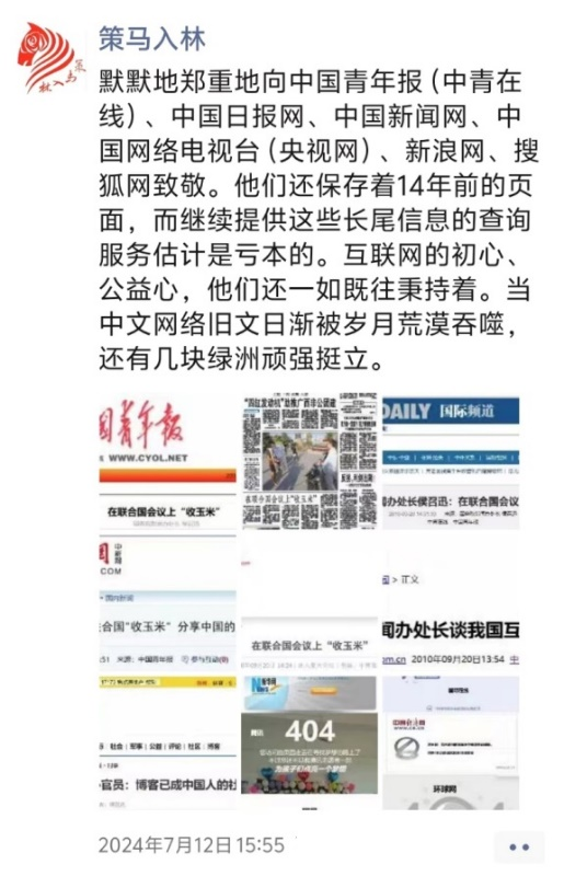 2024年7月3日,我發(fā)了一條朋友圈:前些天看到有人說(shuō)網(wǎng)絡(luò)“崩塌”,有點(diǎn)著慌,馬上去找以前寫(xiě)的一些帖文,真發(fā)現(xiàn)了問(wèn)題。多年前可以搜到數(shù)千上萬(wàn)條自己寫(xiě)的稿子或與己有關(guān)的信息,現(xiàn)在去重、有用的所剩不多,還被一些收費(fèi)網(wǎng)站囤去一些,不交錢不讓看。QQ空間日志(騰訊博客)的一千多篇還在,互動(dòng)也在,鏈接卻多成死鏈。新浪博客的一千多篇也在,互動(dòng)沒(méi)了,考慮到博主需要,設(shè)置了備份按鈕,確實(shí)負(fù)責(zé)任。早已停服的博客中國(guó),竟然還能打開(kāi)。鏈接的新聞網(wǎng)頁(yè)還在的,有新浪網(wǎng)、中國(guó)青年報(bào)中青在線、中國(guó)日?qǐng)?bào)網(wǎng)、中國(guó)新聞網(wǎng)、央視網(wǎng)、搜狐網(wǎng)等。包括人民網(wǎng)、新華網(wǎng)、中國(guó)網(wǎng)、國(guó)際在線、央廣網(wǎng)等大多數(shù)新聞網(wǎng)站及騰訊新聞、網(wǎng)易新聞、鳳凰新聞等,已經(jīng)404或403,而我最多的鏈接是人民網(wǎng)的,真是遺憾。對(duì)低效益的冷寂長(zhǎng)尾內(nèi)容,很多網(wǎng)站平臺(tái)不愿再運(yùn)營(yíng)維護(hù),便卸載斷服?!盎ヂ?lián)網(wǎng)是有記憶的”,這話需要加以限定了,十年記憶就不容易,“永久”“免費(fèi)”已是傳說(shuō)。接下來(lái),有用的盡快備份吧,不管微博微信短視頻啥的,來(lái)有影去無(wú)蹤,或終將煙消云散南柯夢(mèng)。值得敬佩的是一些良心平臺(tái),尚能以公益為重,秉持初心,堅(jiān)持至今,繼續(xù)提供信息服務(wù),不容易不簡(jiǎn)單。