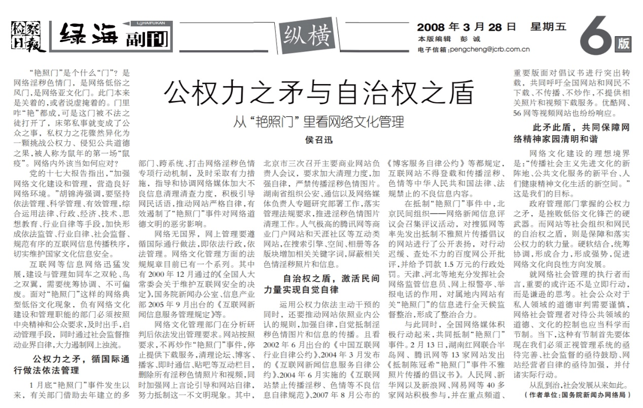 針對(duì)“艷照門”等網(wǎng)絡(luò)低俗文化現(xiàn)象的治理,撰寫(xiě)《公權(quán)力之矛與自治權(quán)之盾——從“艷照門”里看網(wǎng)絡(luò)文化管理》,刊于2008年3月28日《檢察日?qǐng)?bào)》。文章提出,負(fù)有網(wǎng)絡(luò)文化建設(shè)和管理職能的部門要遵循國(guó)際通行做法,依法行政,依法管理,及時(shí)出手,啟動(dòng)管理手段。運(yùn)用公權(quán)力依法主動(dòng)干預(yù)的同時(shí),還要推動(dòng)網(wǎng)站依照業(yè)內(nèi)公認(rèn)的規(guī)則,加強(qiáng)自律,自覺(jué)抵制淫穢色情圖片和信息的傳播。政府管理部門掌握的公權(quán)力之矛,是挫敗低俗文化鋒芒的硬武器。而網(wǎng)站等社會(huì)組織和網(wǎng)民的自治權(quán)之盾,則是保障和落實(shí)公權(quán)力的軟力量。硬軟結(jié)合,統(tǒng)籌協(xié)調(diào),形成合力,促進(jìn)網(wǎng)絡(luò)文化良性發(fā)展。就網(wǎng)絡(luò)社會(huì)管理的執(zhí)行者而言,非常重要的一點(diǎn)是謙遜的思考。社會(huì)公眾對(duì)于私人領(lǐng)域的道德審判需要謹(jǐn)慎,網(wǎng)絡(luò)社會(huì)管理者對(duì)待公共領(lǐng)域的管控也應(yīng)當(dāng)科學(xué)而節(jié)制。當(dāng)下,管理系統(tǒng)亟待完善,社會(huì)監(jiān)督亟待鼓勵(lì),網(wǎng)站經(jīng)營(yíng)者自律亟待加強(qiáng)。