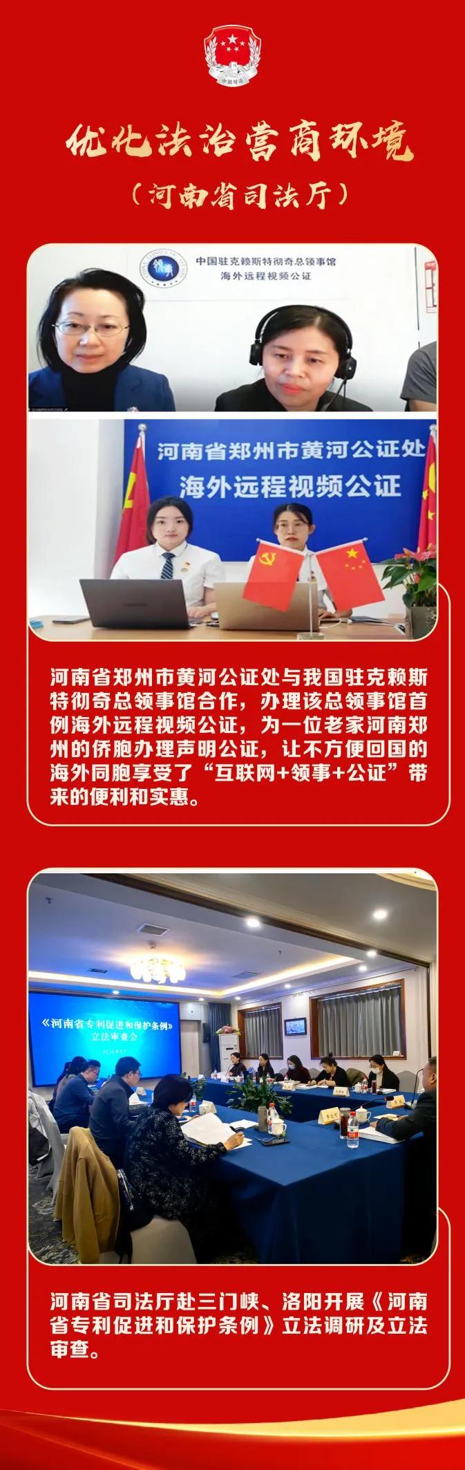 去年以來,我們聚焦發(fā)展新質(zhì)生產(chǎn)力、推進中部地區(qū)崛起等中心工作,圍繞河南省委、省政府提出的錨定“兩個確?!?、持續(xù)實施“十大戰(zhàn)略”、推進“十大建設(shè)”工作部署,不斷優(yōu)化法治化營商環(huán)境,采取了一系列務(wù)實舉措:聚焦提升領(lǐng)導(dǎo)干部法治意識法治思維、提高依法行政能力水平,出臺《關(guān)于進一步加強全面依法治省工作的意見》《河南省領(lǐng)導(dǎo)干部應(yīng)知應(yīng)會黨內(nèi)法規(guī)和國家法律清單》。牽頭制定《河南省營商環(huán)境綜合配套改革法治化專項方案》,部署立法、執(zhí)法、司法、法律服務(wù)、政務(wù)誠信、政務(wù)服務(wù)“六大行動”,明確25項具體任務(wù)。推動出臺《中國(河南)自由貿(mào)易試驗區(qū)條例》《鄭州航空港經(jīng)濟綜合實驗區(qū)條例》,為試(實)驗區(qū)賦權(quán)、松綁,激發(fā)各方主體發(fā)展活力;出臺《河南省保障稅收服務(wù)發(fā)展條例》《河南省專精特新企業(yè)培育支持辦法》和省司法廳服務(wù)保障民營經(jīng)濟發(fā)展10項措施,為中央和河南重大戰(zhàn)略實施提供法治保障。