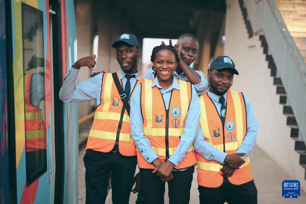 6月12日,在尼日利亞拉各斯,拉各斯輕軌藍線項目動車組列車司機組長伊莎貝拉·亞當斯·伊斯拉埃爾(中)與同事在站臺上合影。新華社發(fā)(中土集團尼日利亞有限公司供圖)