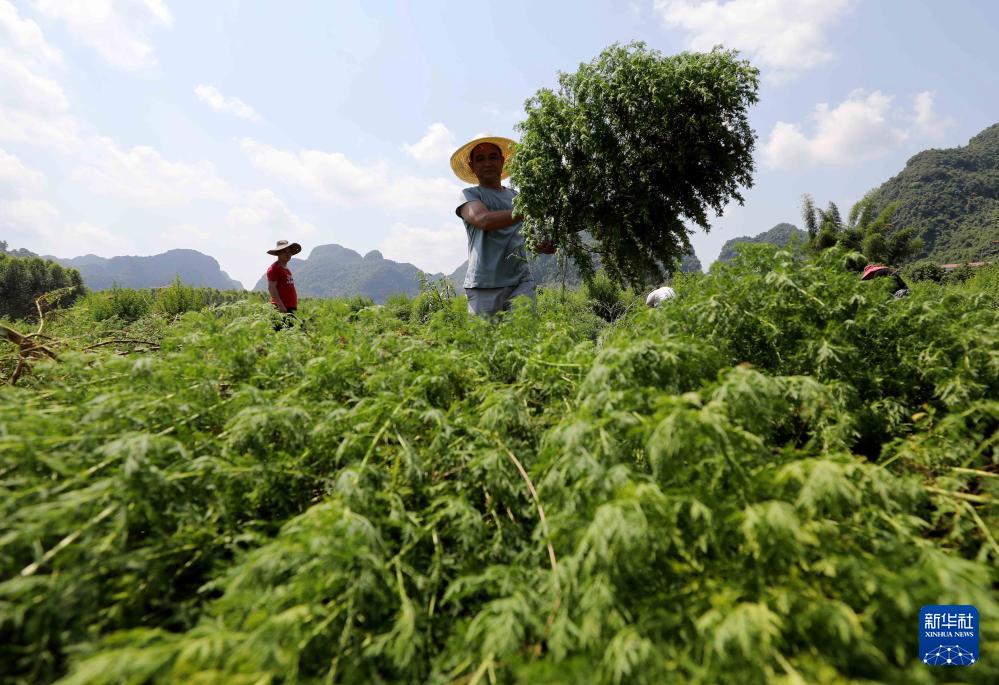 在廣西仙草堂制藥有限責(zé)任公司基地,工人在采收青蒿(2022年7月31日攝)。