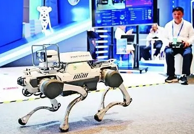 網(wǎng)絡(luò)安全博覽會(huì)上的企業(yè)展示電網(wǎng)巡線機(jī)器狗。新華社記者 鄧華攝