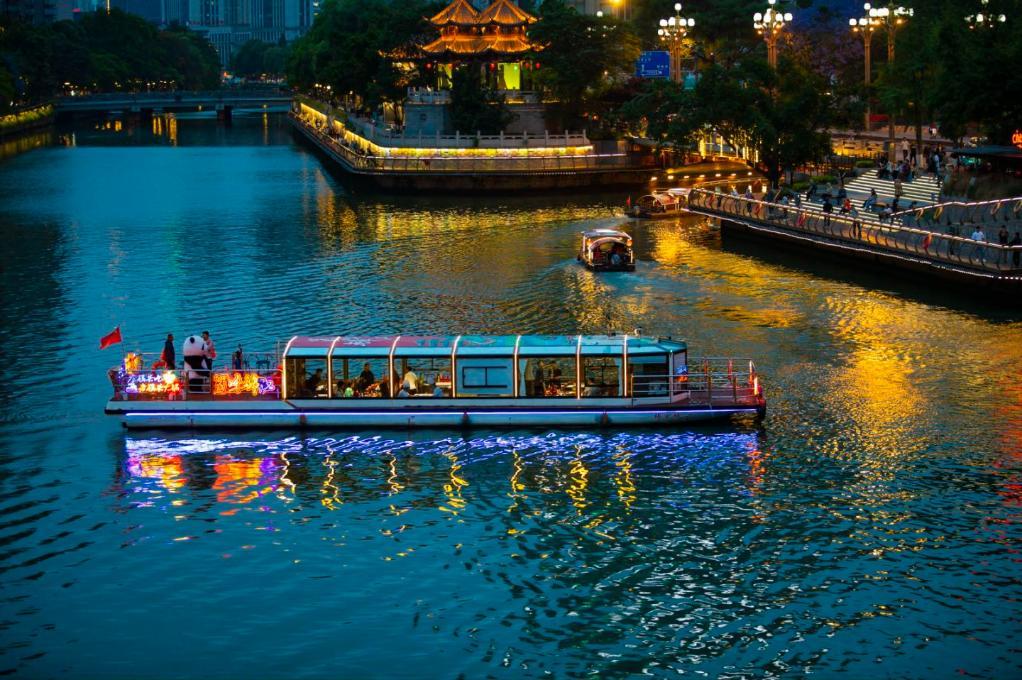 夜幕降臨,一個(gè)“月亮”裝置點(diǎn)亮四川成都錦江東門碼頭,人們在此排隊(duì)等候登船體驗(yàn)“夜游錦江”項(xiàng)目。江面上,靈動(dòng)的“大魚”“神鳥”等飛行裝置伴隨游船行駛飛起;演員扮演嫦娥、玉兔、李白等為游客吟唱詩歌;火鍋船、“江上KTV”、萌寵專線等不同主題游船往來如織。江岸上,沿線茶百戲、漆扇和桂花香囊制作、漢服體驗(yàn)、潮玩市集、街頭藝人表演等豐富活動(dòng)吸引市民游客駐足體驗(yàn)。