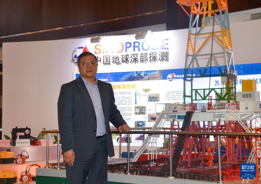 黃大年在中國(guó)地球深部探測(cè)項(xiàng)目年會(huì)上(2013年4月18日攝),身旁是他率領(lǐng)團(tuán)隊(duì)研發(fā)的“地殼一號(hào)”萬(wàn)米大陸科學(xué)鉆探機(jī)的展示模型。 新華社發(fā)