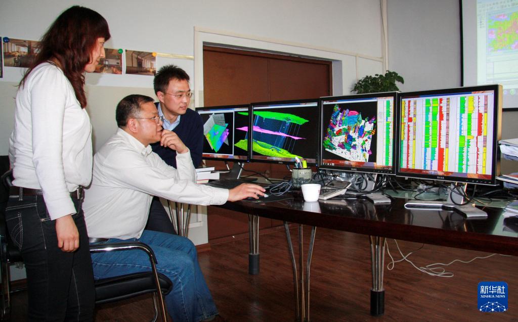 黃大年(左二)帶領(lǐng)科研團隊成員研究問題(2010年11月22日攝)。 新華社發(fā)