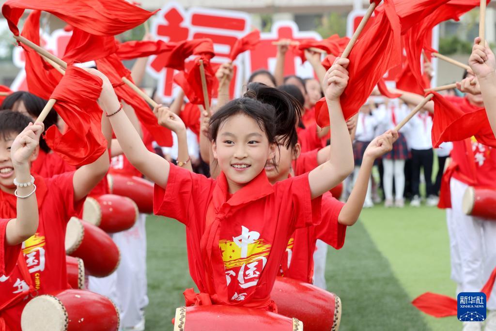 9月27日,浙江省湖州市德清縣上柏小學(xué)學(xué)生在“童心向黨 祝福祖國”主題活動中表演節(jié)目《中國范》腰鼓頌。