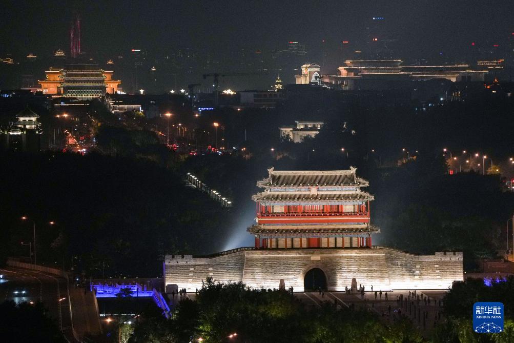 9月26日拍攝的完成景觀照明設(shè)施提升后亮燈的永定門城樓和中軸線上的建筑。